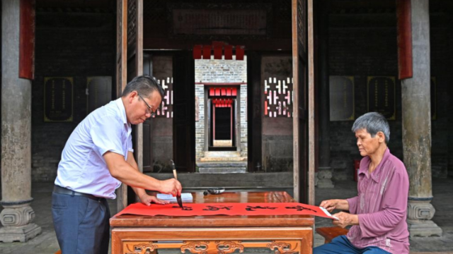 8月15日,一名楹联爱好者在大芦村古宅里写对联。 广西钦州市灵山县佛子镇大芦村以“古建筑、古楹联、古树”三古著称。 大芦村有完好的明清建筑群,古建筑群面积达25万平方米。古宅融合自然,依山傍水而建,形成“背靠青山面朝绿水”的居住环境。古宅多为砖木结构,设计独特,兼具实用与美观,保存有传世楹联305副,内容以修身、持家等为主。 大芦村以劳姓人口占主导。劳氏始祖明嘉靖年间定居于此,至今已传十九代,历经470余年,形成独特的耕读传家文化。该村于2012年被列入第一批中国传统村落名录。 新华社记者 周华 摄