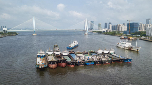 这是将于9月4日24时停航的海口铁路南港(9月4日摄,无人机照片)。 受台风“摩羯”迫近影响,在海南省海口市,船只陆续回港避风。水利部4日发布的汛情通报显示,9月1日23时,今年第11号台风“摩羯”在菲律宾以东洋面生成,预报将于6日下午至夜间在海南万宁到广东电白一带沿海登陆,登陆时中心附近最大风力14至16级(强台风级或超强台风级)。 新华社记者 郭程 摄