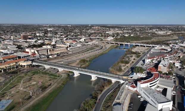 俯瞰墨美边境东段 这是2月16日在墨西哥塔毛利帕斯州新拉雷多市拍摄的一处国际桥(无人机照片)。 墨美两国边界长度超过3100公里,东段主要以格兰德河为界。美国总统特朗普1月20日宣誓就职后,美国海关与边境保护局宣布取消所有移民申请进入美国避难预约,并驱逐非法移民。美国、墨西哥分别向边境增兵,以加强边境安全。 新华社记者 李梦馨 摄