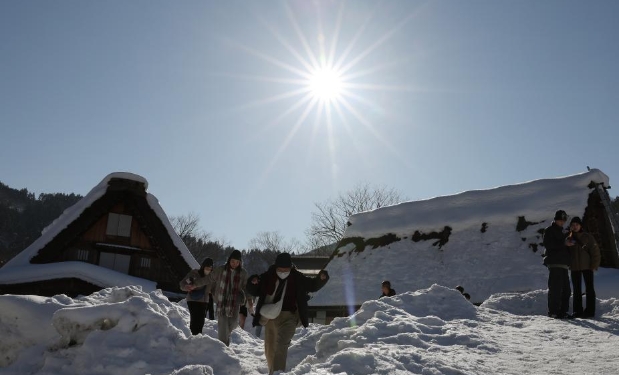 魅力亚太丨探访白川乡“合掌造”传统村落 2月25日,游客在日本岐阜县白川乡的“合掌造”村落参观游览。 白川乡位于日本岐阜县,四周高山环绕,冬季降雪量大,积雪厚度常超过1米,这种寒冷多雪的环境塑造出“合掌造”房屋独特的屋顶设计。“合掌造”房屋的屋顶是用木材和稻草建造,无需使用钉子;屋顶呈接近60度的陡峭人字形,便于让积雪滑落;房梁为东西走向,使房屋可以获得充足的采光量并减小风力。“合掌造”房屋的诸多精巧设计无不体现了当地居民的生活智慧。 新华社记者 贾浩成 摄