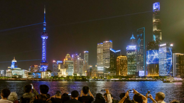 4月17日,人们在上海外滩拍摄对岸陆家嘴庆祝浦东开发开放35周年光影秀。 新华社记者 王翔 摄
