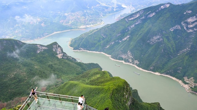 6月9日,游客在重庆奉节三峡之巅风景区观赏瞿塘峡景色。