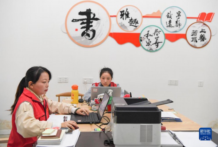 11月28日,余白杨(左)和同事在办公室整理信息。
