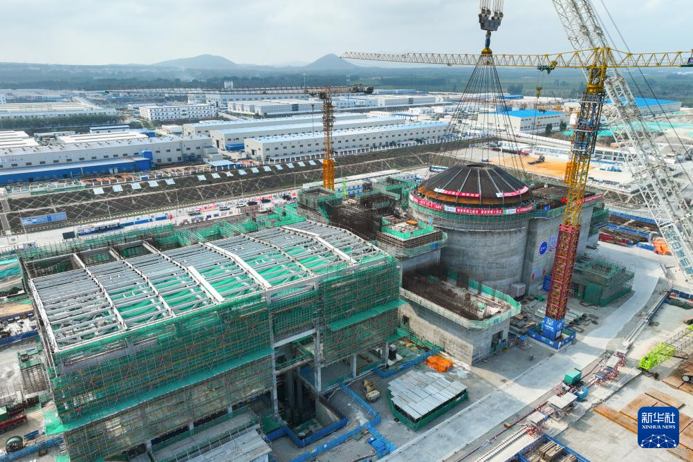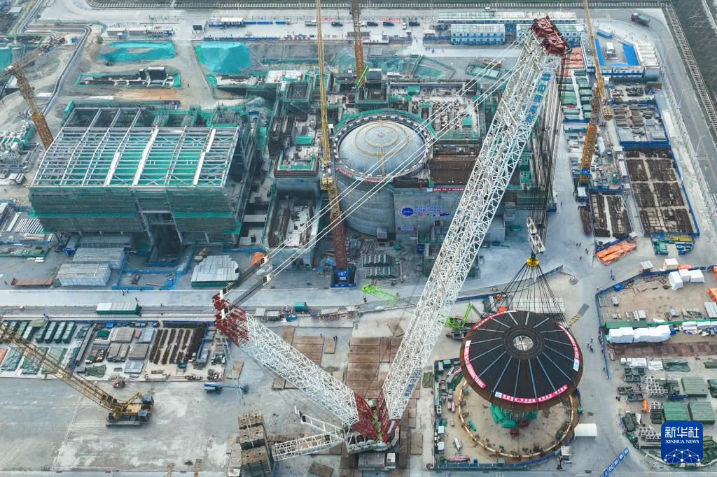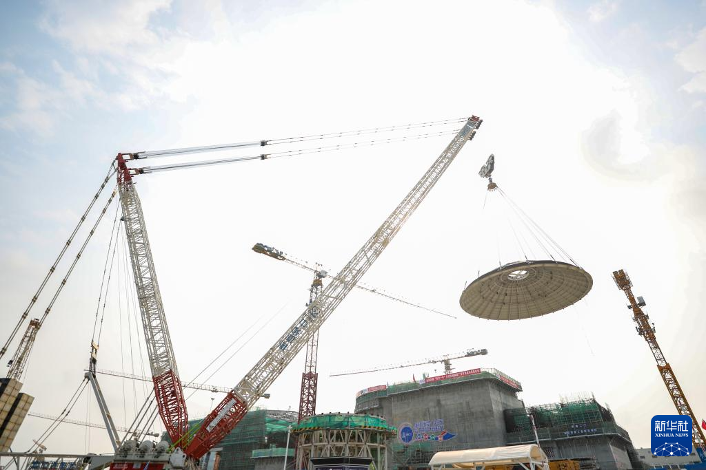 2月6日,海南昌江核电厂多用途模块式小型堆科技示范工程“玲龙一号”外穹顶在进行吊装作业。 当日,海南昌江核电厂多用途模块式小型堆科技示范工程“玲龙一号”外穹顶吊装完成。外穹顶的吊装完成标志着反应堆厂房的主体结构已全部施工完成,并为后续的反应堆厂房的封顶奠定了基础。 据了解,“玲龙一号”是全球首个开工建造的陆上商用多用途模块式小型压水堆,是中核集团继“华龙一号”后我国核电自主创新的又一重大成果。“玲龙一号”预计2026年建成投运,每年发电量可达10亿千瓦时,可满足海南省52.6万户家庭用电需求。 新华社记者 张丽芸 摄