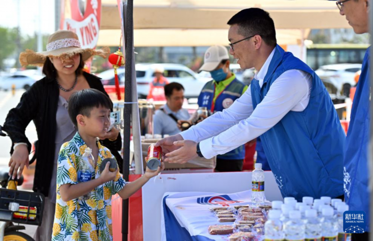 2月17日,志愿者为等待过海的旅客派送食品。 新华社记者 郭程 摄