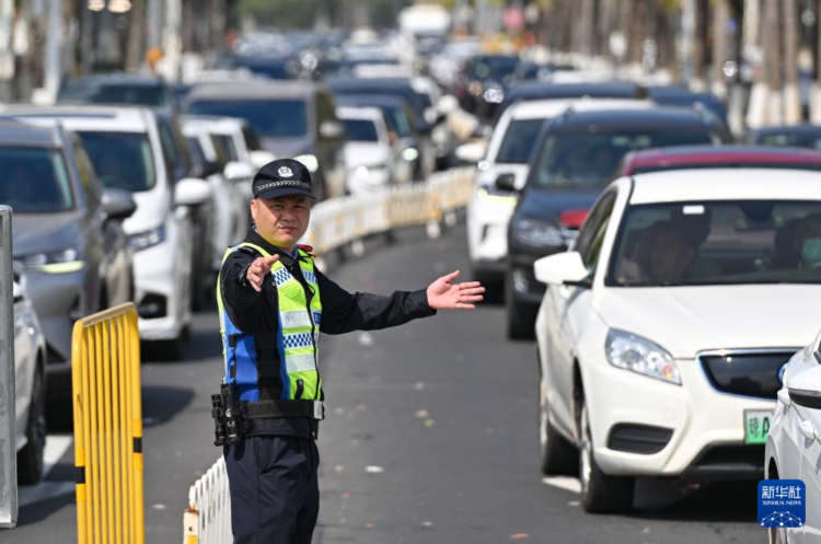 2月17日,警察在海口市新海港附近道路疏导交通。 新华社记者 郭程 摄