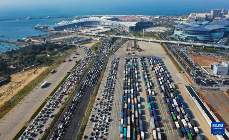 2月17日,大批车辆在海口市新海港等待登船(无人机照片)。 当日是春节假期最后一天,琼州海峡迎来返程高峰,海口市各港口待渡场处于饱和状态,大批车辆和旅客在港口附近等待过海。海口市各部门与港口展开联动,组织人员维持排队秩序,为车主旅客提供应急药品、饮用水等物品,保障旅客有序过海。 新华社记者 郭程 摄
