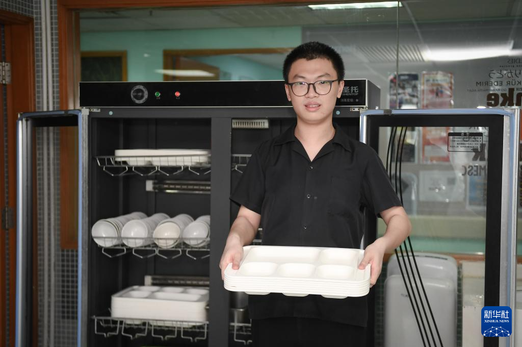这是3月27日在深圳益田威斯汀酒店拍摄的“心青年”关昊。23岁的关昊2021年6月入职深圳益田威斯汀酒店,担任员工餐厅服务员。他现在跟其他员工一样,每天上班8小时,负责摆放清洗好的餐盘、清理垃圾和打扫餐厅卫生。在领导和同事眼里,他是个“眼里有活儿”的好员工。