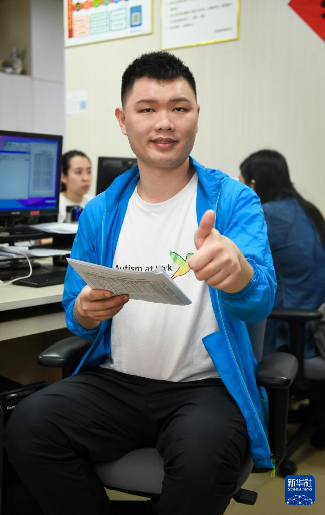 这是3月27日在深圳市自闭症研究会拍摄的“心青年”戴劲宇。29岁的戴劲宇2018年10月入职深圳市自闭症研究会,担任办公室职员,目前他主要负责扫描复印资料和室内消毒工作。