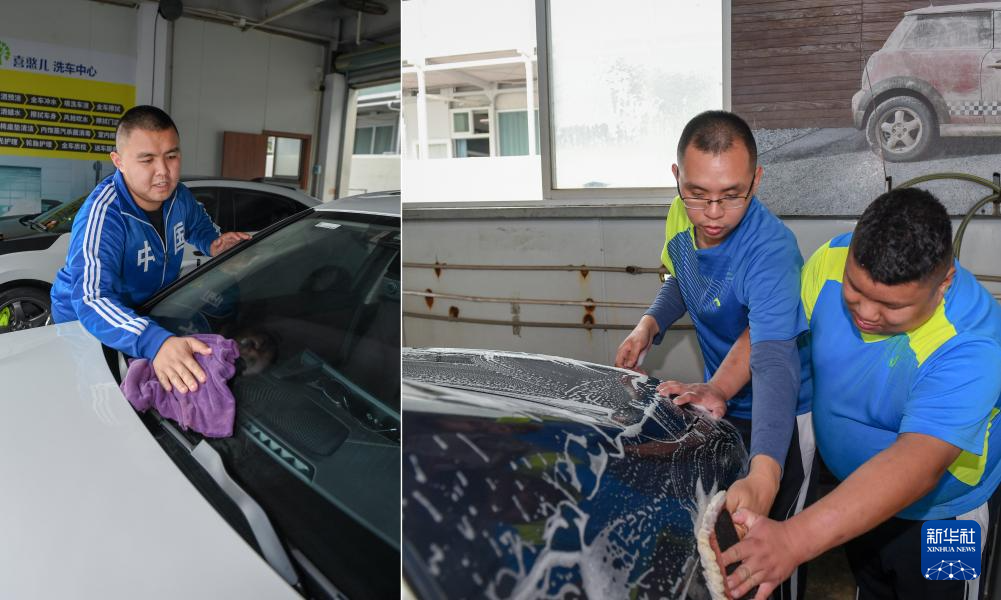 这是一张拼版照片:3月22日,在深圳喜憨儿洗车中心,左图为“心青年”吴华坚在擦拭车辆,右图为“心青年”许继伦(右二)和同事一起洗车。