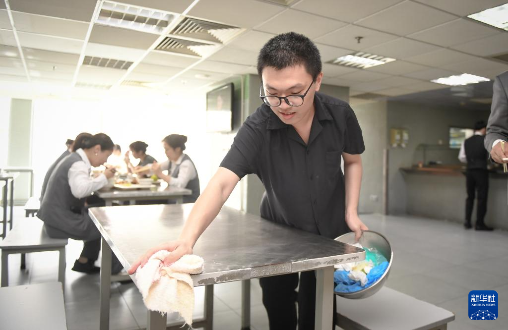 3月27日,在深圳益田威斯汀酒店员工餐厅,“心青年”关昊擦拭餐桌。23岁的关昊2021年6月入职深圳益田威斯汀酒店,担任员工餐厅服务员。他现在跟其他员工一样,每天上班8小时,负责摆放清洗好的餐盘、清理垃圾和打扫餐厅卫生。在领导和同事眼里,他是个“眼里有活儿”的好员工。