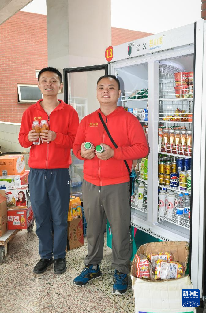 这是3月21日在深圳新百丽工业园拍摄的“心青年”黄煊宁(右)和曹弘毅。24岁的黄煊宁和27岁的曹弘毅2023年9月起在新百丽工业园里负责厂区的自动售货机上货工作,包括搬运和摆放零食、饮料等。在团队伙伴的帮助下,他们从摆放饮料瓶这种动作学起,目前已经基本胜任这份工作。