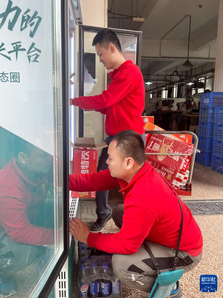 3月21日,在深圳新百丽工业园,“心青年”黄煊宁(前)和曹弘毅给自动售货机上货。24岁的黄煊宁和27岁的曹弘毅2023年9月起在新百丽工业园里负责厂区的自动售货机上货工作,包括搬运和摆放零食、饮料等。在团队伙伴的帮助下,他们从摆放饮料瓶这种动作学起,目前已经基本胜任这份工作。