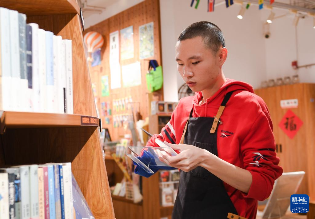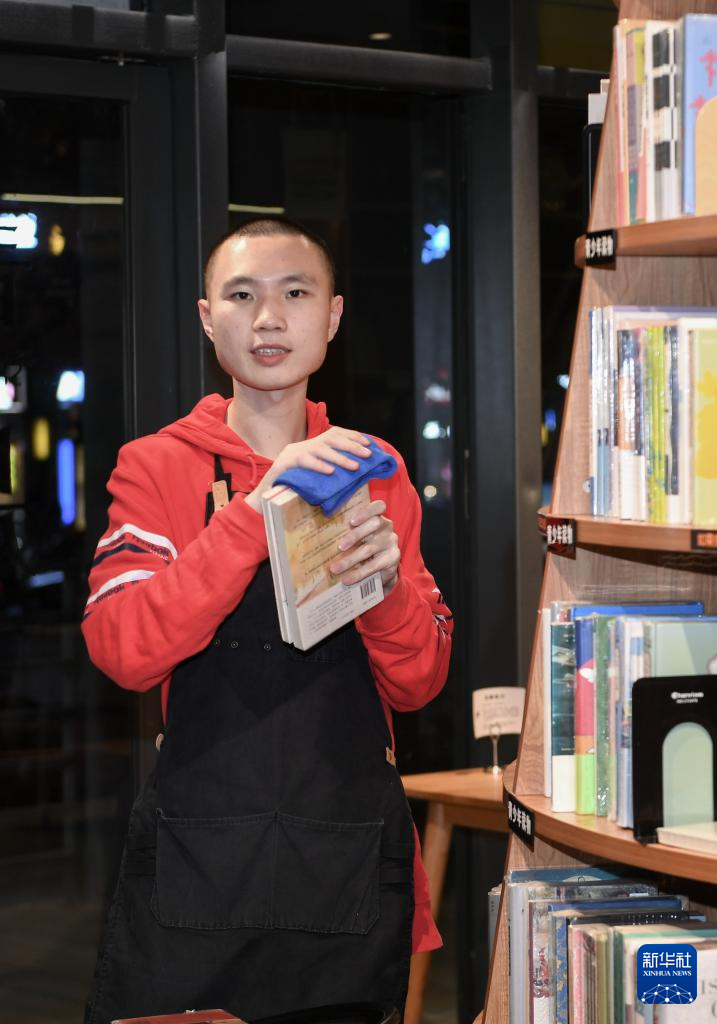 这是3月20日在深圳时间行者书店拍摄的“心青年”潘一锴。23岁的潘一锴2022年5月起在深圳时间行者书店兼职,每天工作2到3小时,负责擦拭整理书籍书架以及清洁地面。