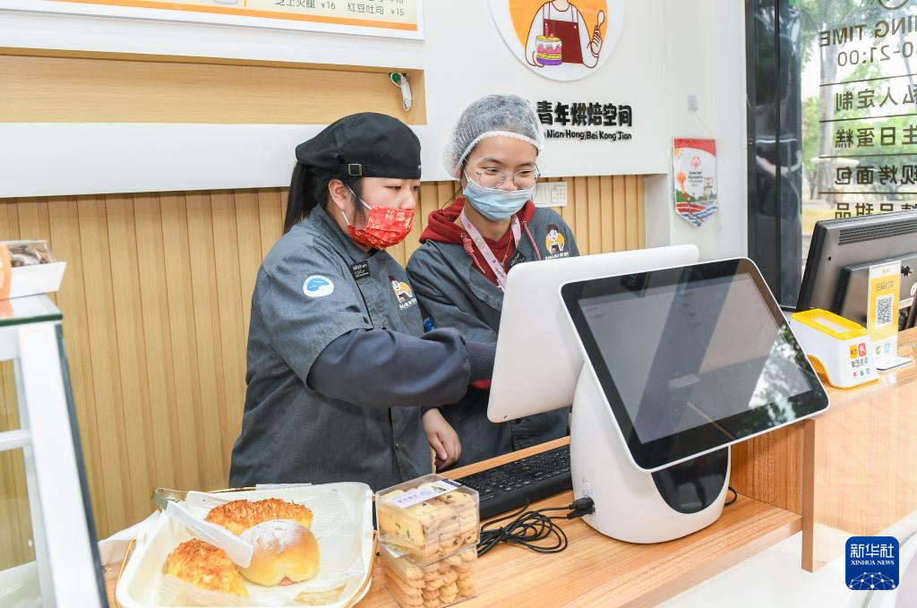 这是3月21日在深圳海纳心青年烘焙空间拍摄的“心青年”袁安琪(右)和邱敏怡。22岁的袁安琪和28岁的邱敏怡2023年6月起在海纳心青年烘焙空间担任收银员,两人搭档给客人结账和打包,也会跟老师一起制作面包和糕点,虽然动作有点慢,但在大家的理解和支持下不断进步。