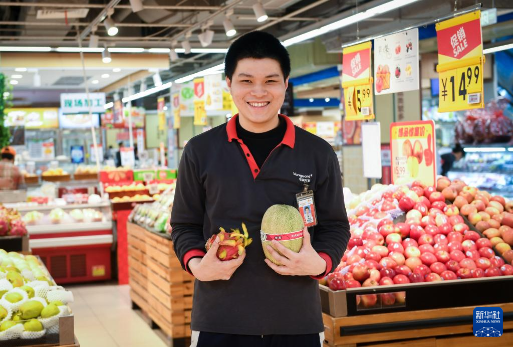 这是3月22日在深圳华润万家超市翠竹店拍摄的“心青年”冉钰龙。19岁的冉钰龙2023年9月入职华润万家深圳翠竹店,每个月上班96小时,主要工作内容是整理生鲜果蔬区的货品和检查产品保质期。他从小就在这家超市买东西,长大后成了这里的员工。