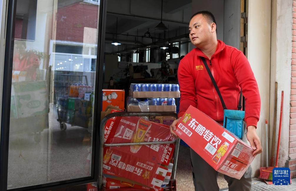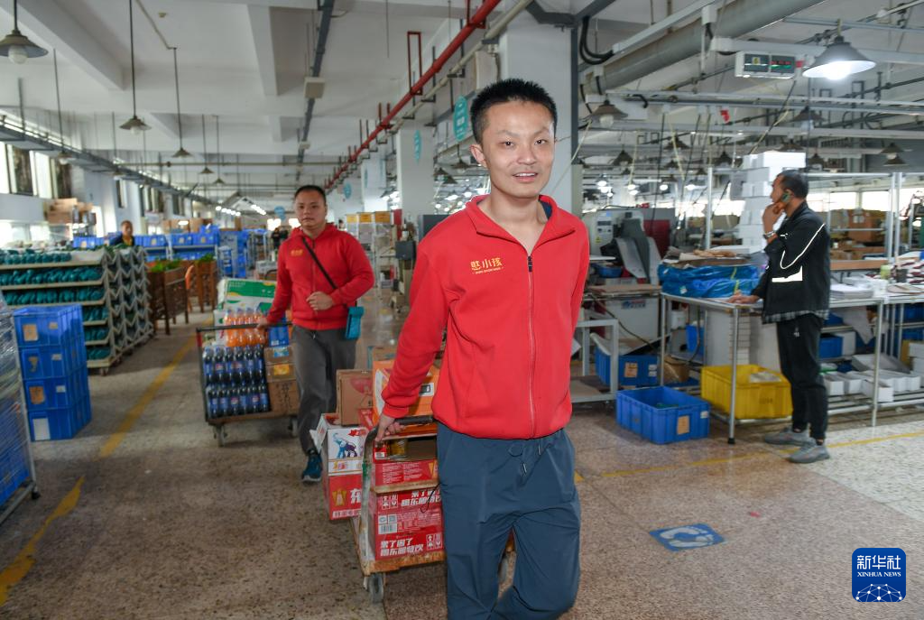 3月21日,在深圳新百丽工业园,“心青年”黄煊宁在厂房里搬运饮料。24岁的黄煊宁2023年9月起在新百丽工业园里负责厂区的自动售货机上货工作,包括搬运和摆放零食、饮料等。在团队伙伴的帮助下,他从摆放饮料瓶这种动作学起,目前已经基本胜任这份工作。