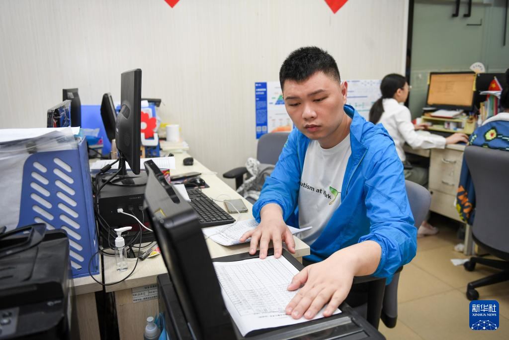 3月27日,在深圳市自闭症研究会,“心青年”戴劲宇扫描资料。29岁的戴劲宇2018年10月入职深圳市自闭症研究会,担任办公室职员,目前他主要负责扫描复印资料和室内消毒工作。