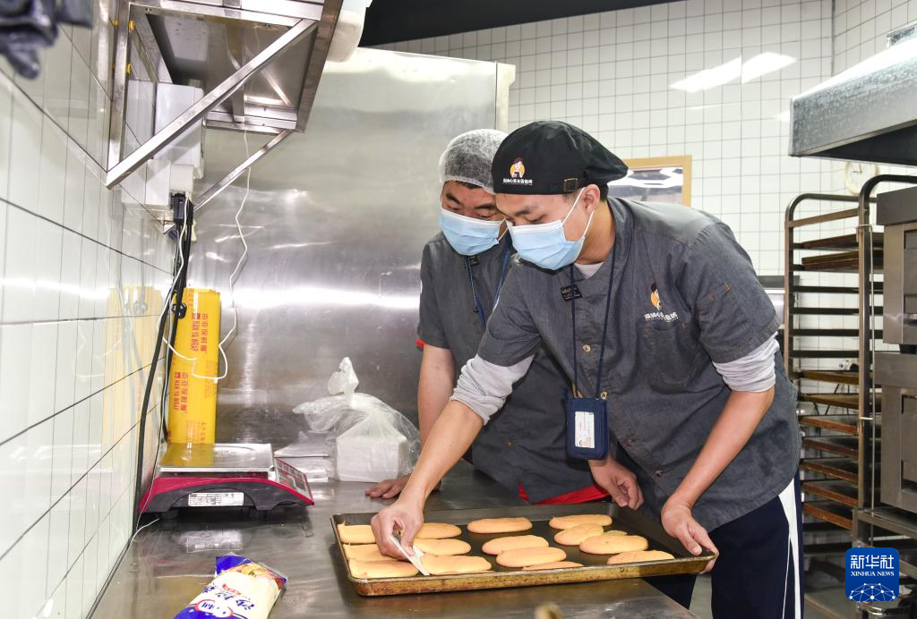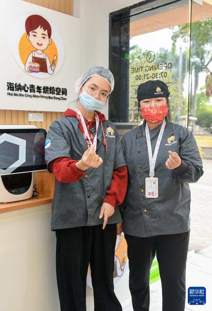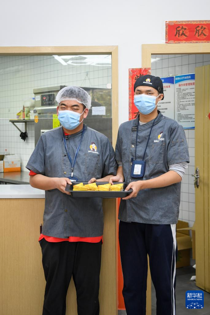 这是3月21日在深圳海纳心青年烘焙空间拍摄的“心青年”刘瀚阳(右)和彭旌锐。25岁的刘瀚阳和23岁的彭旌锐2023年6月起在深圳海纳心青年烘焙空间担任面包师。除了跟老师一起制作面包和点心外,他们还可以承担收银和送外卖等工作。
