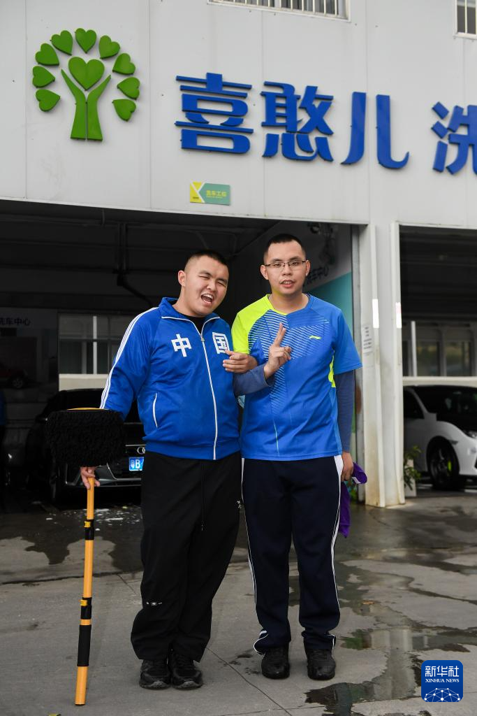 这是3月22日在深圳喜憨儿洗车中心拍摄的“心青年”吴华坚(左)和许继伦。19岁的吴华坚和30岁的许继伦2023年7月入职深圳喜憨儿洗车中心,担任洗车工。喜憨儿洗车中心现有15名心智障碍员工。