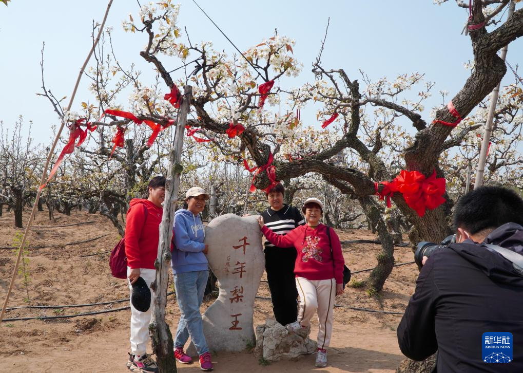4月9日,在山东潍坊昌邑市饮马镇的博陆山古梨园,游客与开花的高树龄梨树合影。