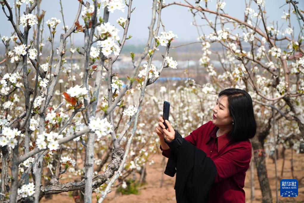 4月9日,在山东潍坊昌邑市饮马镇的博陆山古梨园,游客拍摄盛开的梨花。