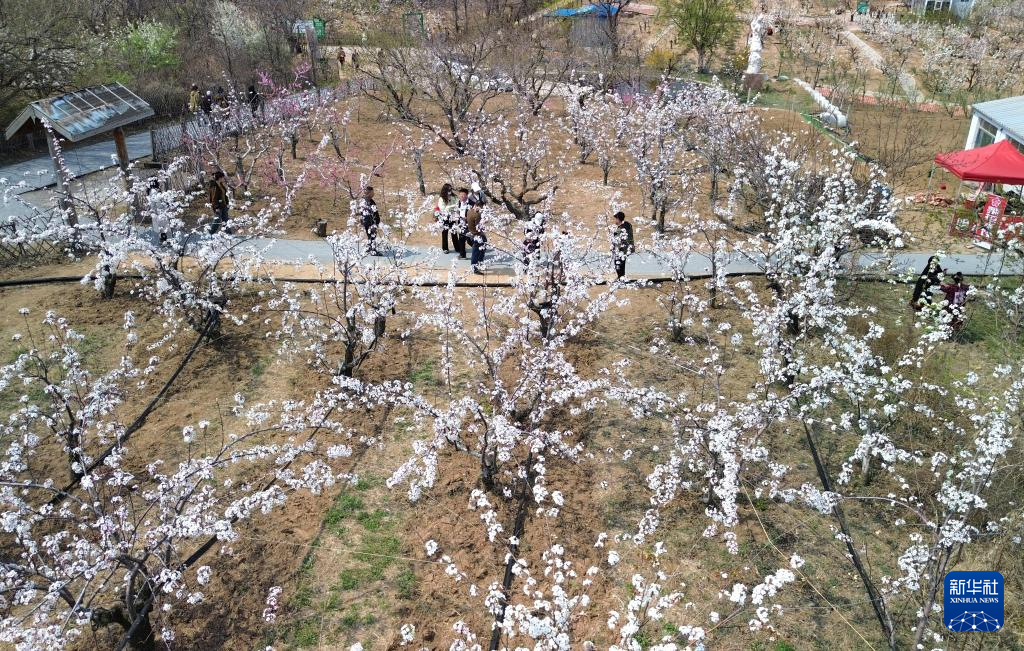 4月9日,游客在山东潍坊昌邑市饮马镇的博陆山古梨园赏花游玩(无人机照片)。