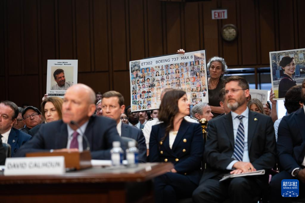 6月18日,在美国华盛顿,人们在波音CEO戴夫·卡尔霍恩出席国会听证会期间举牌抗议。 美国波音公司首席执行官戴夫·卡尔霍恩18日首次出席美国国会参议院就波音飞机频繁暴露安全问题举行的听证会,遭联邦参议员炮轰。他承认企业的安全文化有瑕疵,但坚称企业正在改进,致力于提升产品安全性能。 新华社记者 刘杰 摄