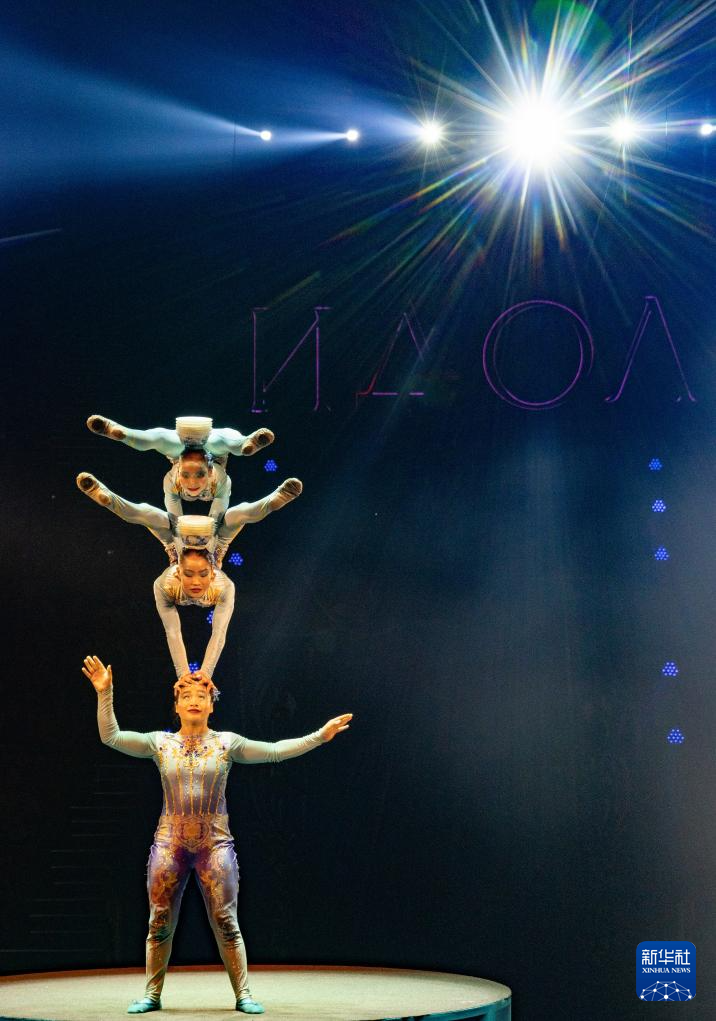 7月21日,四川省遂宁市杂技团演员在俄罗斯莫斯科国家大马戏剧院举行的“偶像—2024”国际马戏艺术节上表演节目《熠熠生辉—顶碗》。该节目获得专业评委会金偶像奖和大众媒体评委会铜马圈奖。