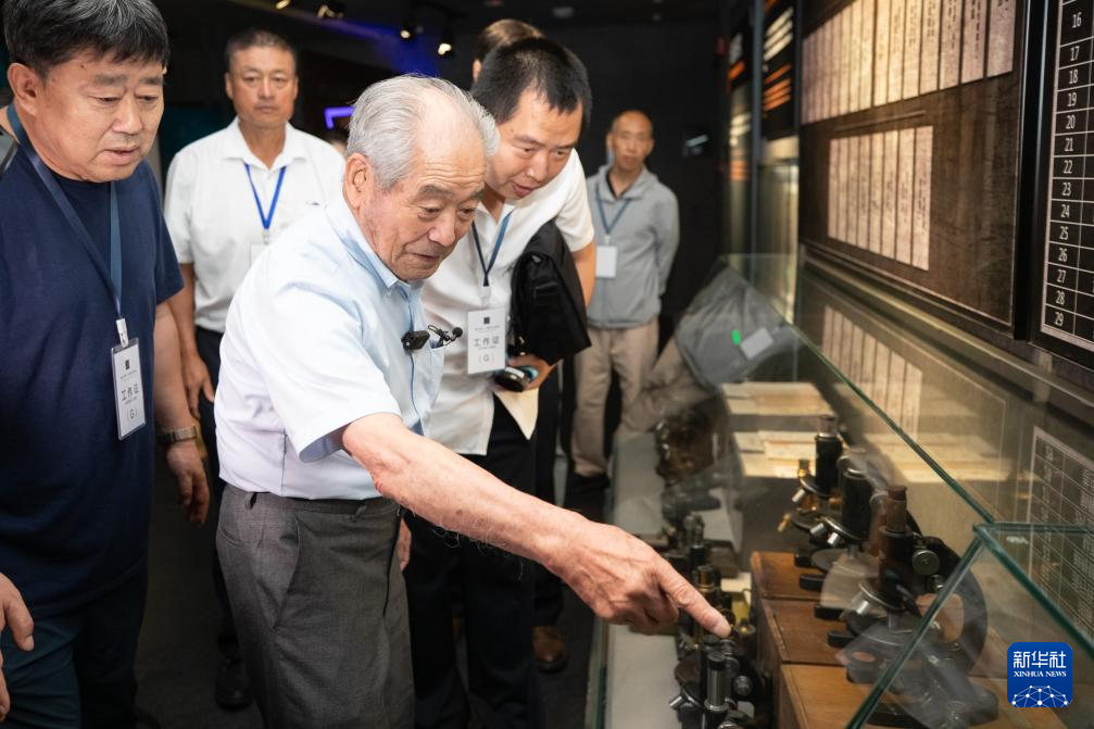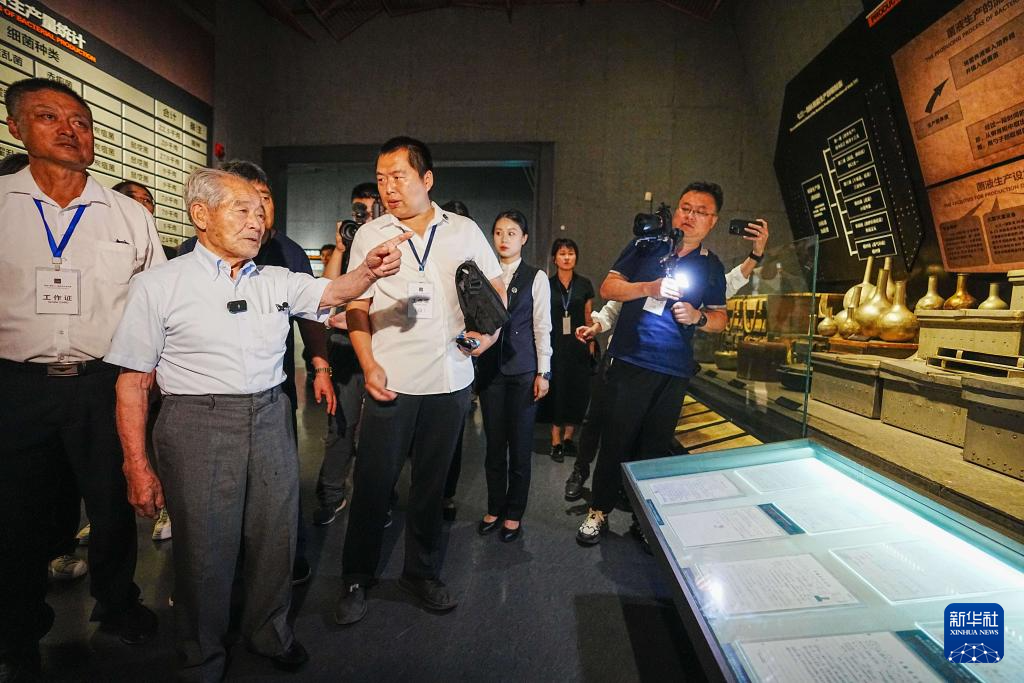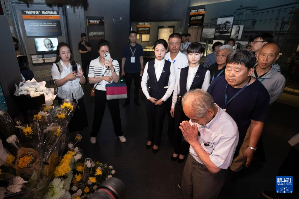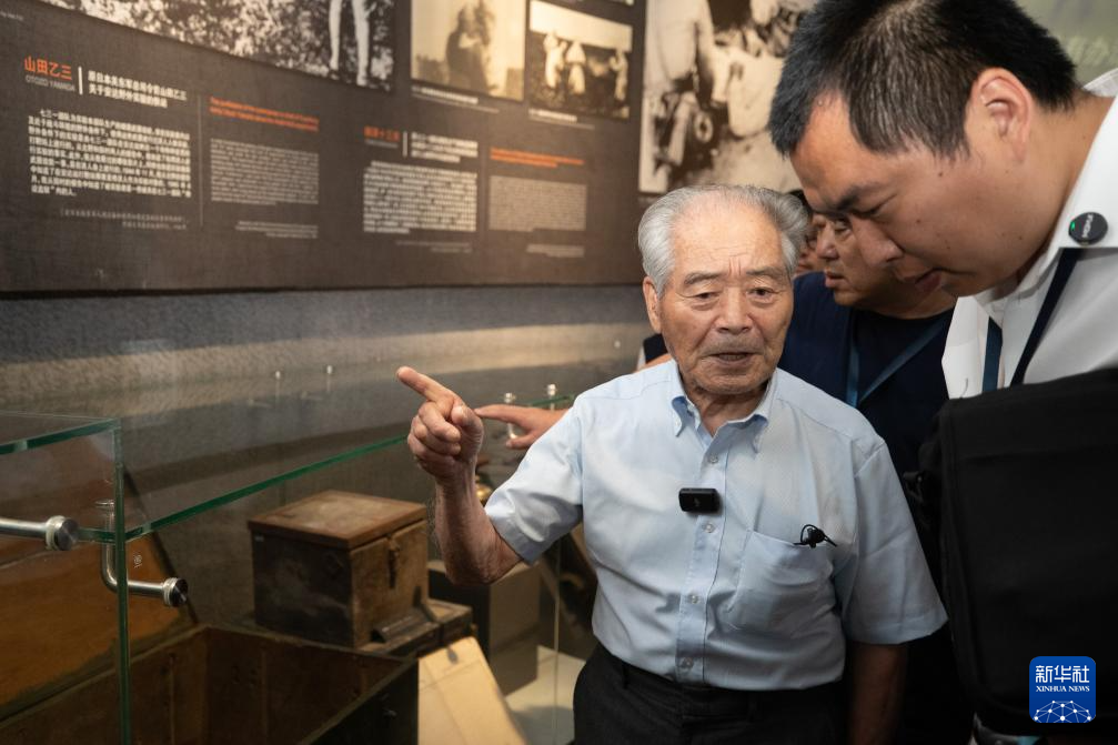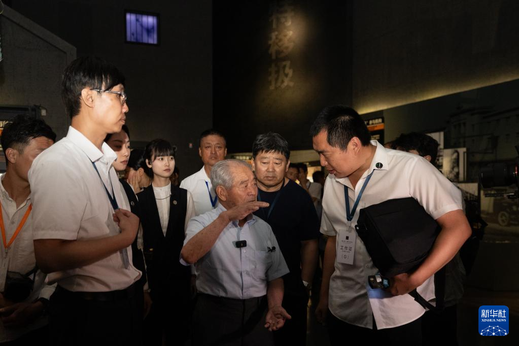 8月13日,清水英男(前中)在侵华日军第七三一部队罪证陈列馆内参观。