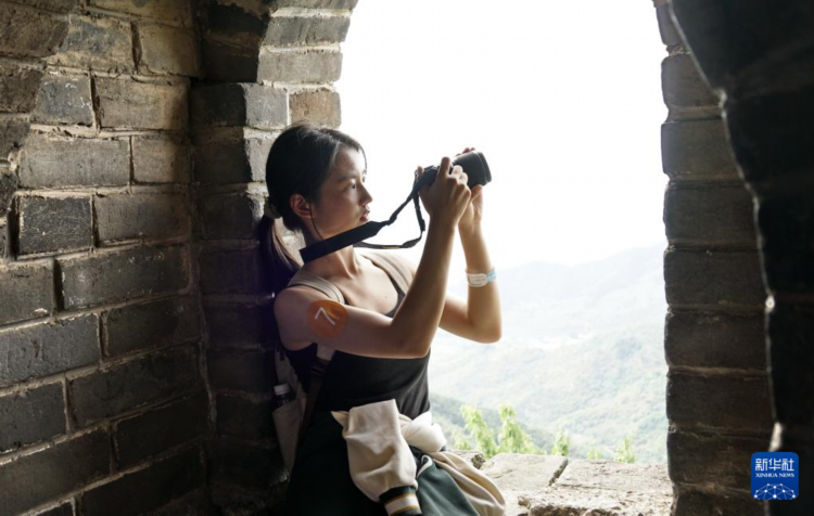 8月25日,一位参加第三十届海峡两岸大学生新闻营的台湾学生在拍摄北京慕田峪长城。