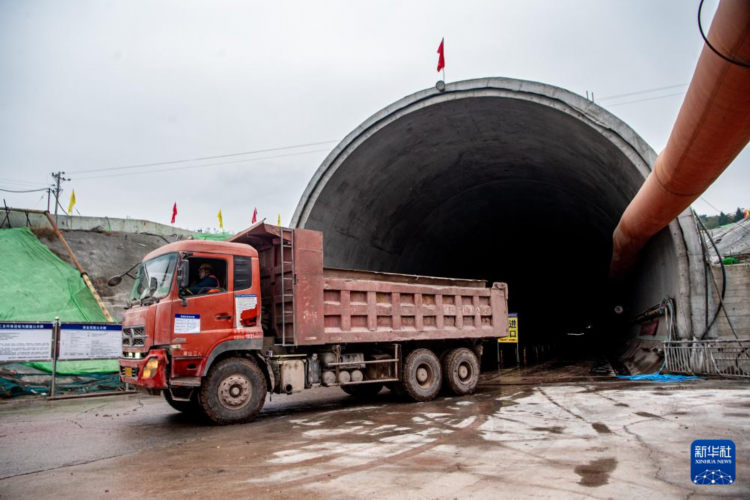 12月12日,施工车辆驶出成达万高铁石坪村隧道。
