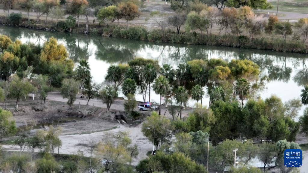 12月11日,执法车辆在墨西哥边境城市雷诺萨的格兰德河边巡逻,河对岸是美国(无人机照片)。 新华社记者 李木子 摄
