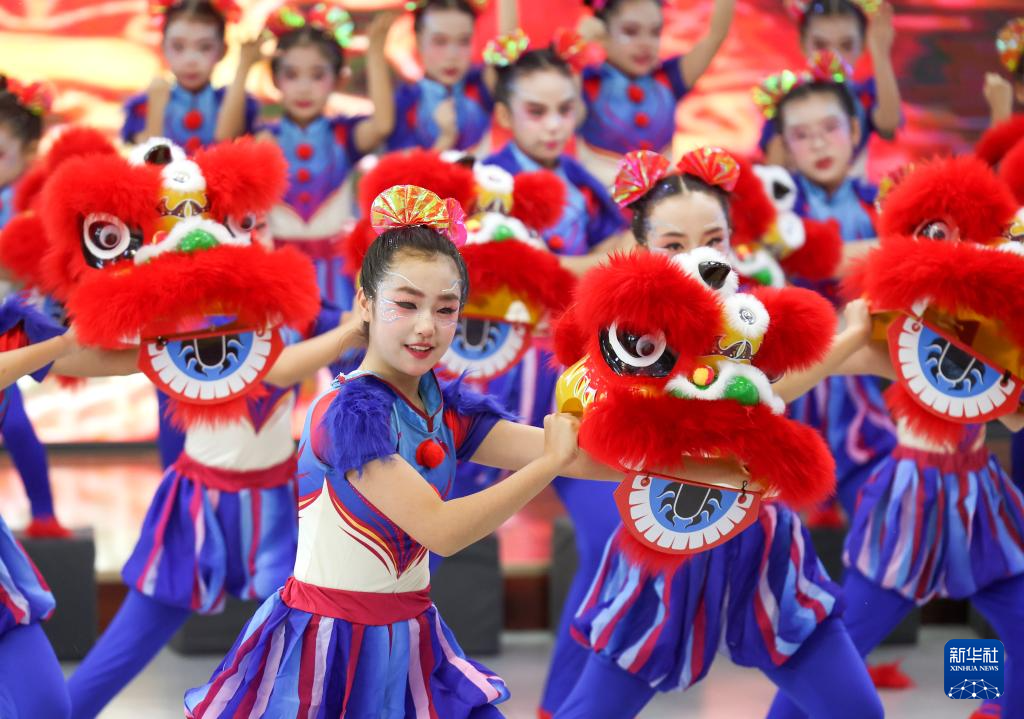 2024年12月31日,新疆教育学院实验小学学生在进行舞狮表演。