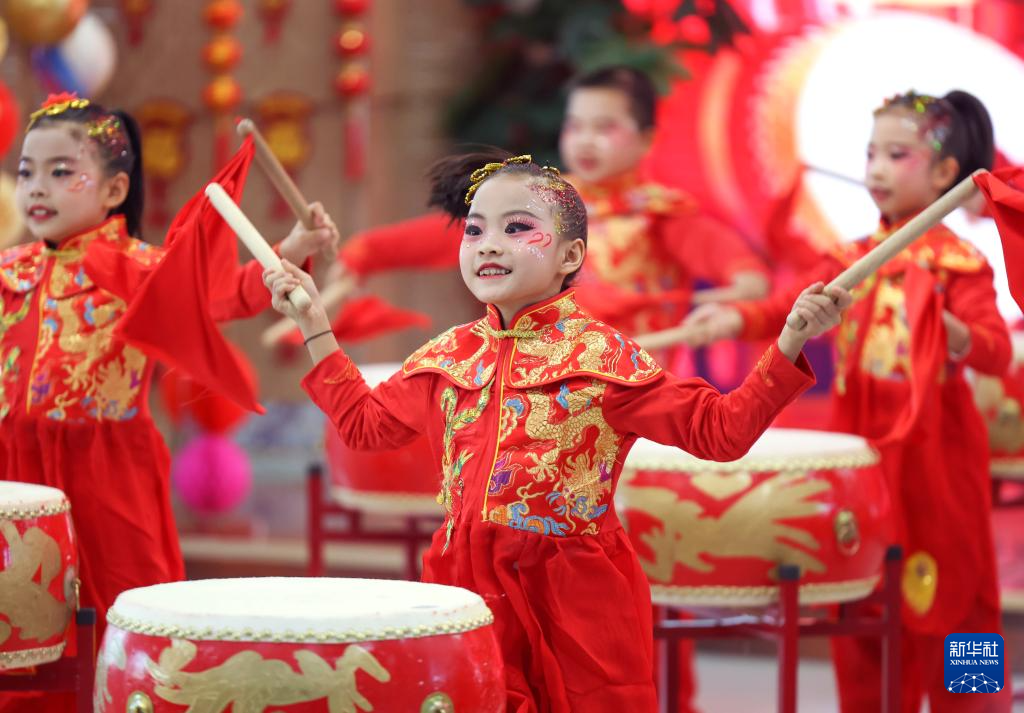2024年12月31日,新疆教育学院实验小学学生在进行锣鼓表演。