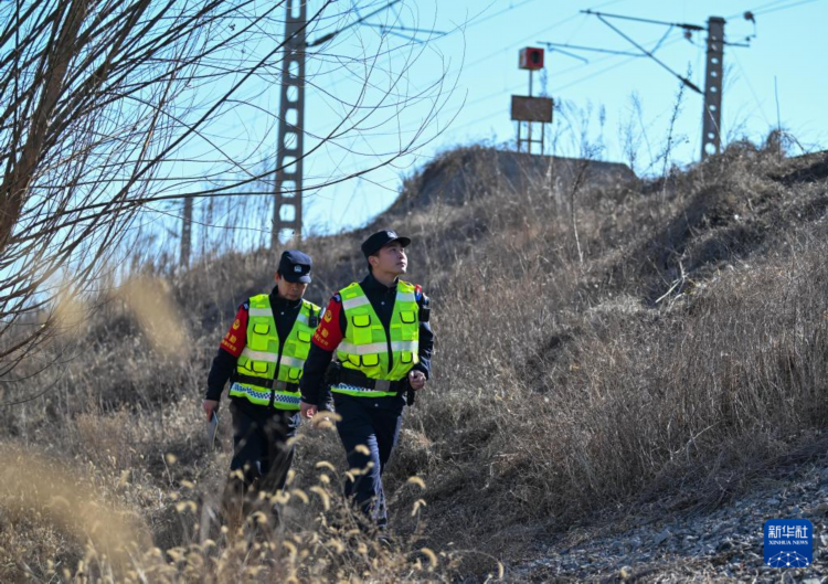 铁路线路民警刘文汉(左)与李亚鹏在值守辖区内巡线(2月13日摄)。