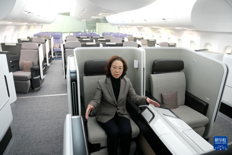 3月5日,赵春玲在C929展示样机内介绍客舱设计。