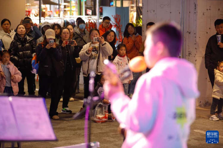 “知了小乐团”在成都市天府红购物中心演出,吸引不少观众观看(3月30日摄)。