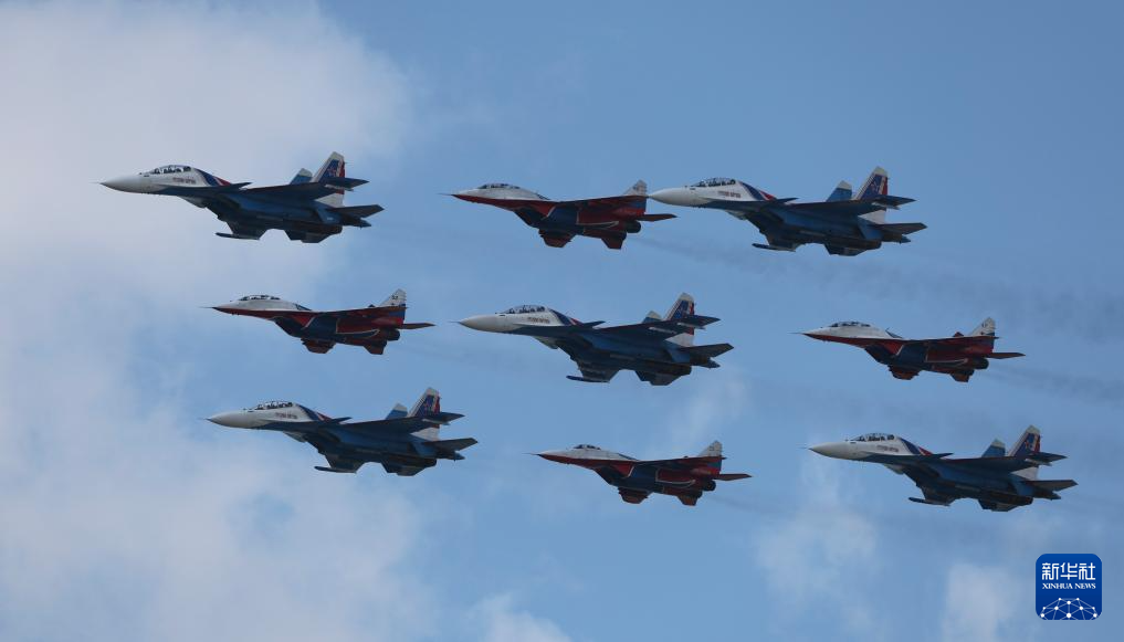 俄罗斯举行纪念苏联伟大卫国战争胜利80周年阅兵式 5月9日,在俄罗斯首都莫斯科,战机编队参加纪念苏联伟大卫国战争胜利80周年阅兵式。 当地时间5月9日,俄罗斯举行盛大庆典,纪念苏联伟大卫国战争胜利80周年。 新华社记者 丁海涛 摄
