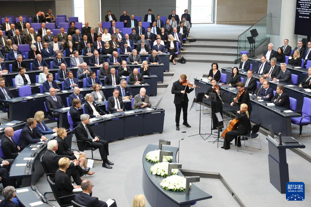 德国举行活动纪念二战欧洲战场胜利80周年 这是5月8日在德国首都柏林国会大厦拍摄的纪念活动现场。 当日,德国举行活动纪念第二次世界大战欧洲战场胜利80周年。 新华社记者 杜哲宇 摄