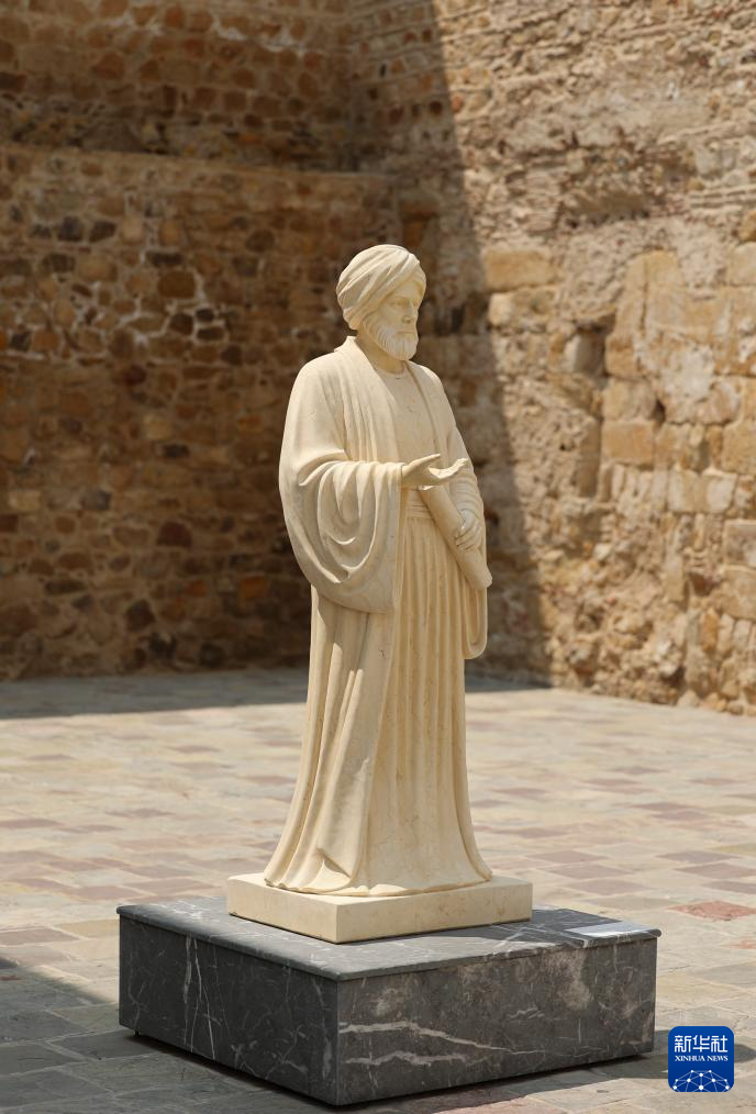 这是5月17日在摩洛哥丹吉尔的伊本·白图泰纪念馆内拍摄的伊本·白图泰雕像。新华社记者 霍晶 摄