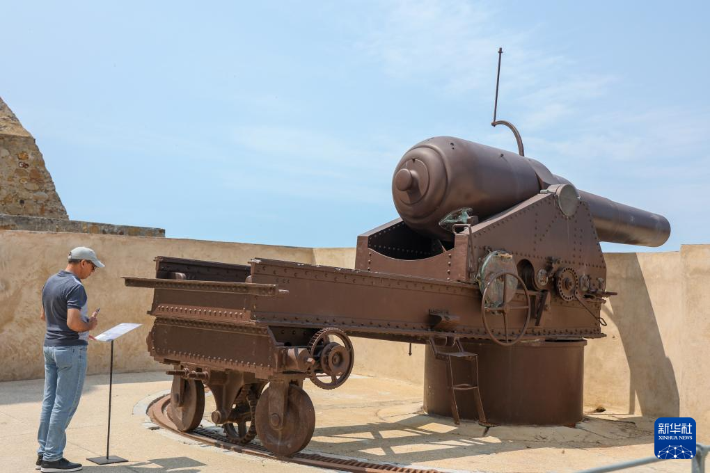 5月17日,在摩洛哥丹吉尔,观众在伊本·白图泰纪念馆内参观要塞炮。新华社记者 霍晶 摄