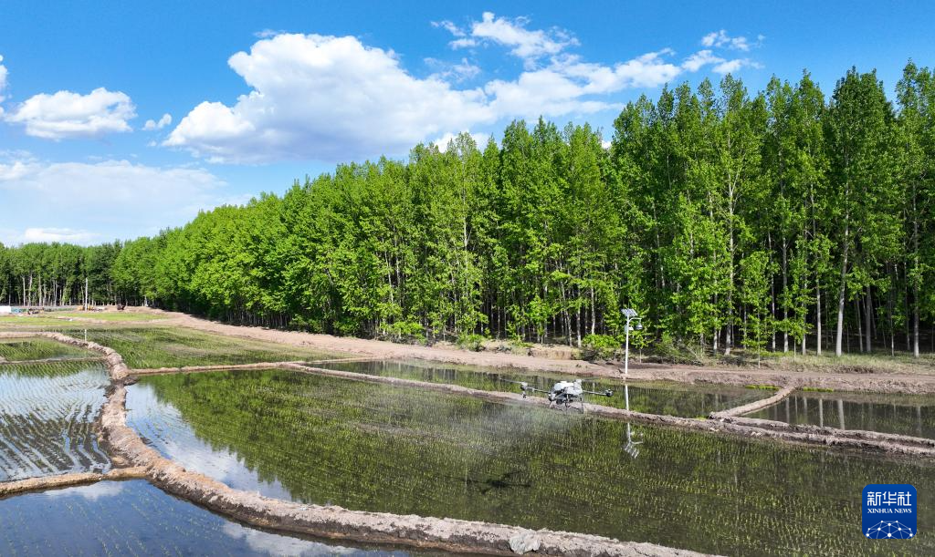 5月22日拍摄的内蒙古兴安盟扎赉特旗好力保镇的稻田(无人机照片)。