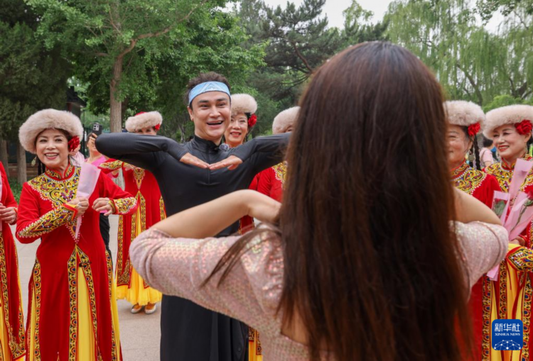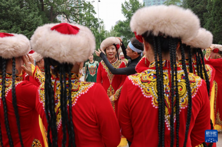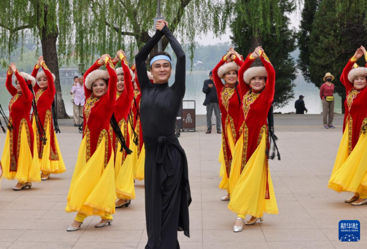 5月24日,热合木土拉·阿马努拉在北京龙潭公园教授新疆民族舞蹈。