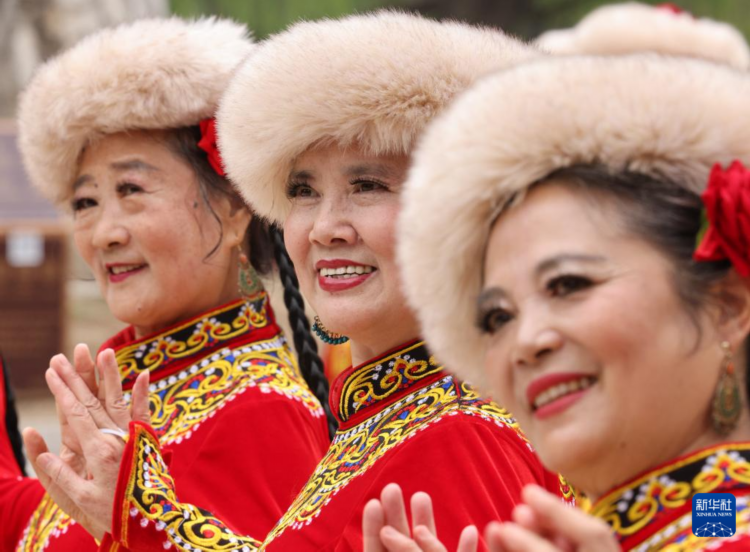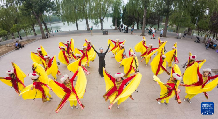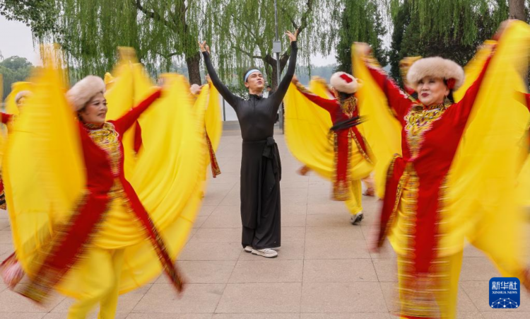5月24日,在北京龙潭公园,几位老年舞蹈爱好者在练习新疆民族舞蹈。这支由20多人组成的舞蹈队有10位队员年龄超过70岁。