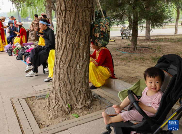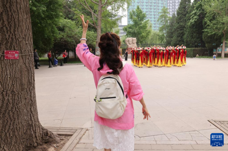 5月24日,在北京龙潭公园,一位游客模仿着新疆民族舞蹈的动作跳起舞来。