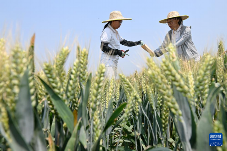 5月26日,河北省曲周县刘庄科技小院的学生在试验田内收集麦粒样本。