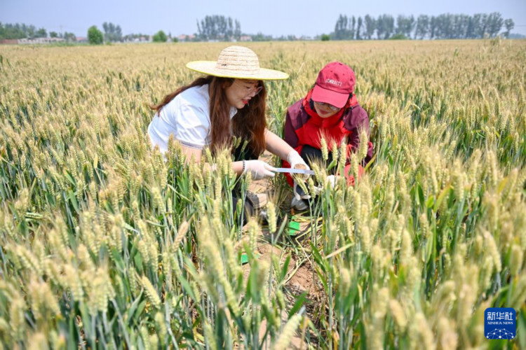 5月26日,河北省曲周县傅庄科技小院的学生在麦田里测量植株高度。