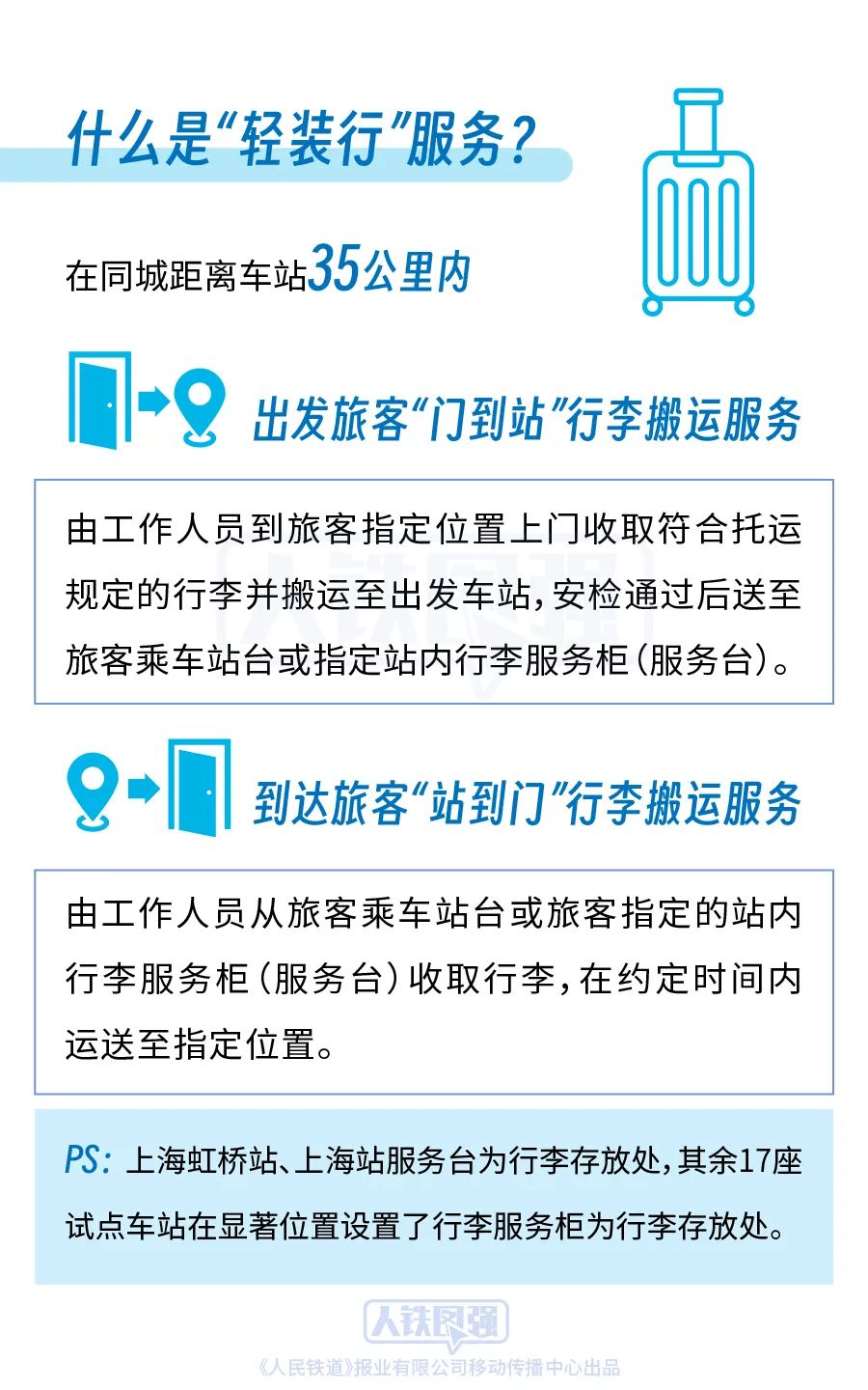 在同城距离车站35公里内,旅客根据实际需要可选择以下两种“轻装行”服务。一是出发旅客“门到站”行李搬运服务。选定此项服务后,由工作人员到旅客指定位置上门收取符合托运规定的行李并搬运至出发车站,安检通过后,送至旅客乘车站台或指定站内行李服务柜(服务台)。二是到达旅客“站到门”行李搬运服务。选定此项服务后,由工作人员从旅客乘车站台或旅客指定的站内行李服务柜(服务台)收取行李,在约定时间内运送至指定位置。目前,上海虹桥站、上海站服务台为行李存放处,其余17座试点车站在显著位置设置了行李服务柜为行李存放处。