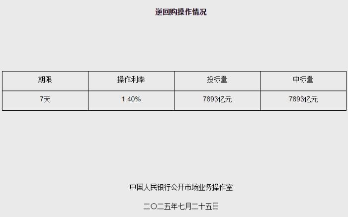 据央行网站消息,2025年7月25日中国人民银行以固定利率、数量招标方式开展了7893亿元逆回购操作。具体情况如下: